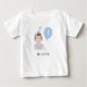 Comemore o aniversário do seu filho com esta ilustração fofinha de cachorro com um chapéu de festa e um balão. Personalize esta camisa de aniversário divertida adicionando o nome e a idade do seu filho. O chapéu da festa e o balão estão em cor azul.