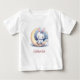 Camiseta de bebê super fofa com coelhinho branco fofo usando um lindo laço azul sentado em uma lua encantadora com algumas estrelas douradas caindo e algumas nuvens azuis empoeiradas.