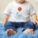 A camiseta do primeiro primeiro aniversario do Dinossauro apresenta um dinossauro azul pastel segurando um balão vermelho com o dentro número 1 do balão em um cenário colorido e divertido do tema do dinossauro. Personalize-o com a idade e o nome do seu filho.