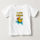 Bebê, crianças, e T-shirts de criança, longas camisetas de manga, camisas de suor, fatos de futebol, fatos orgânicos, vestidos sem manga, chapéus, rompentes e outros bebês com um pato amarelo giro a saltar na poça azul e texto amarelo que diz "Eu amo patos!"
