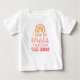 A imagem apresenta uma t-shirt branca para crianças, com um design lúdico e colorido. O design inclui um arco-íris e a frase "Eu posso ser PEQUENO, mas sou o CHEFE" em texto rosa e vermelho, acentuado com pequenas formas cardíacas. Esta camisa é provavelmente destinada a crianças pequenas e transmite uma mensagem divertida e confiante.