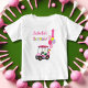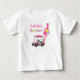 Esta camiseta apresenta um carrinho de golfe rosa com bolinhas estacionado ao lado da trilha, um bolo de aniversário e balões de hélio brilhantes — encimados por um balão número 1 em negrito e tipografia de "aniversário" em cores pastéis.
