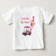 Esta camiseta apresenta um carrinho de golfe rosa com bolinhas estacionado ao lado do caminho, um bolo de aniversário e balões de hélio brilhantes—encimados por um balão com o número 1 em negrito e tipografia de "aniversário" em cores pastéis.