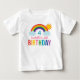 Camisa de aniversário infantil alegre e brilhante apresenta um design de arco-íris / tema de festa sobre o arco-íris com nuvens e sol. As cores do arco-íris incluem: vermelho, laranja, amarelo, rosa, verde, azul turquesa, azul e roxo.