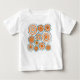 Esta camiseta de bebê tem um design de anéis e círculos em tons de laranja com linhas lacrimogêneas atravessando atrás deles formando flores em um campo de branco.