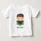 Um bebê com um desenho de um garoto fofo numa fantasia de aranha com membros ligados à sua roupa e controlados pelos seus braços. Um par de suspensórios verdes está se segurando nas calças dele. Ele tem uma pequena decoração de teia no cabelo. Uma roupa de Dia das Bruxas amistosa e adorável para bebês e bebês para fazer truques ou tratar. O texto diz "Trick or Tratat!", que você pode personalizar com sua mensagem ou o nome da criança.