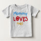A mamãe ama-me T-shirts, camisetas de manga comprida, fatos-macaco, fatos orgânicos, vestidos sem manga, camisas de rebuliço, chapéus, T-shirts raglan e outros roupas para bebês com texto azul, vermelho e dourado e design cardíaca que lê Mamães me ama!