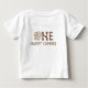 Camiseta de bebê para o primeiro aniversário do menino com tema de acampamento, com um urso marrom e raposa, fogueira e barraca e algum texto que parece madeira. Ideal para uma festa de primeiro aniversário com tema de acampamento.