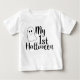 Minhas 1ruas de Halloween Cute Baby Ghost Baby T-Shirts mostram o texto "My 1rua Halloween" em moderna escrita de caligrafia à mão negra com letra tipografia e acentua com um lindo bebê ou fantasma de menina. Perfeito para a primeira festa de Halloween ou celebração do bebê. Elaborado por ©Evco Holidays www.zazzle.com/store/evcoholidays