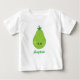 Camiseta branca e na moda com uma adorável pera sorridente kawaii e um espaço de texto editável para seu nome em um roteiro ousado moderno.