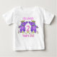 Ursos roxos de pelúcia vestidos com adoráveis coroas amarelas e flores cor-de-rosa, azuis e verdes, dançando entre as flores e segurando um punhado de balões coloridos com a palavra FELIZ. Esta camisa de aniversário de 2 anos trará um sorriso a uma garota especial no seu segundo aniversário. Personalize com o nome dela para torná-lo especial. Design original do Anura Design Studio.
