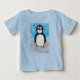 Feliz design de pinguim na camiseta de bebê. Pinguim giro na neve com pássaros azuis voando ao seu redor.