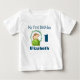 Uma camiseta de bebê que diz: "Meu Primeiro Aniversário" Personalize com Nome e Idade. Um desenho animado de um macaquinho espiando por trás de um arbusto verde. Cercada por uma coroa de folhas tropicais.