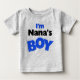 Eu sou o Boy T-shirts de Nana, camisetas compridas de manga, fatos de corpo incluindo fatos orgânicos, e fatos de futebol, chapéus, romances, T-shirts escuras, T-shirts de raglan e outros roupas com um brilhante design de texto azul e preto que diz que eu sou o Nana's Boy!