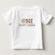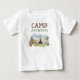 Camisa de bebê de primeiro aniversário com tema de camping para menino, apresentando um urso marrom e um local de acampamento com uma montanha ao fundo.