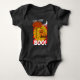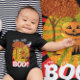 Camiseta fácil para fantasia de Halloween ou festa da colheita para o bebê. Ótimo para a festa da sua Igreja! Família de abóboras fofas ao lado de uma árvore com folhas de outono laranjas em uma camiseta. Lua branca e nuvens com uma família de abóboras de Halloween sorridentes e amigáveis com um BOO! amigável. Com olhos engraçados em cima de cada letra grande! Fundo com listras gráficas vermelhas e amarelas. meio que parece com um design de bandeira do sol japonês