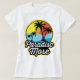 Este logotipo circular, atraente aos olhos, apresenta uma vibrante e retrorinspirada cena solar tropical moldada por uma borda amarela arrojada. Dentro ao círculo, as silhuetas de três palmeiras ficam altas contra um céu gradiente que se transforma de amarelo quente no topo para laranja feroz e vermelho próximo ao horizonte — evocando a hora do ouro sobre um paraíso da ilha. Abaixo, bandas em camadas de turquesa e azul profundo representam ondas oceânicas calmas, completando a vibração da praia idílica.