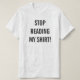 Tem o seguinte texto: "PARE DE LER MINHA CAMISA!"