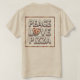 Esta camiseta tem uma imagem de pizza contemporânea com as palavras PEACE LOVE e PIZZA em cores branca, azul, amarela, laranja, vermelha e preta. O O em LOVE é uma imagem de pizza em forma de coração com fatias de pepperoni e queijo. A imagem é uma imagem de estilo de arte tipográfica. A camiseta é uma camisa básica de homem de cor Areia.
