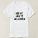 Pergunte-me como fazer uma camiseta branca e negra do Voluntário. Design minimalista elegante. Texto preto personalizado em t-shirt de cor branca editável. Unissex. Disponível em muitas cores e opções de estilo. Excelente para um voluntário, centro comunitário, organização, ong, caridade, campanha, etc
