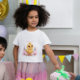Sua busca pela camiseta básica infantil perfeita chegou ao fim! Esta camiseta de algodão ultra-suave apresenta um adorável pintinho cercado por flores delicadas, criando um design doce e divertido. Personalize-a com o nome da criança para criar uma peça única e especial que ela vai adorar usar.