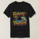 Esta design apresenta uma camiseta preta com a palavra "Pesca" no topo, com uma letra estilizada amarela e azul. Abaixo de "Pesca" está "-Meu-" em um roteiro vermelho menor. Abaixo de "-My-" está a palavra "Terapia" em uma fonte azul e laranja estilizada. A design inclui um gráfico de uma vara de pesca e um peixe saltando da água.