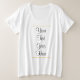 Texto manuscrito manual Script personalizado Modelo feminino com tamanho mais camisa branca básica.