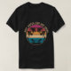 Esta roupa preta apresenta um vibrante design circular que mostra uma cena de praia com palmeiras, duas cadeiras de praia viradas para o oceano e um pôr do sol colorido ou nascer do sol. O texto "ÁGUA SAL E SUN SHINE" tem curvas em torno da parte superior e inferior do círculo. Isso evoca um sentimento de relaxamento e um amor pela praia.