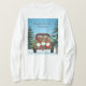 Estes três gnomos estão pendurados na traseira de um velho caminhão de coleta na neve. Os flocos de neve estão caindo nas árvores. O texto diz "Prendendo-me com os meus Gnomos".