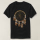 Um design de dreamcatcher com acabamentos em dourado e marrom que inclui um círculo de bambu redondo com teia da vida com penas em tons marrons e contas vermelhas sobre um fundo de penas macias.
