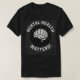 Este design de camiseta retrorreflectora angustiada com a frase "MATÉRIAS DE SAÚDE MENTAL!", exibida em letras maiúsculas e em negrito. O texto é organizado em torno de uma ilustração central de um cérebro, que é estilizado com uma folha crescendo de baixo, simbolizando o crescimento, o bem-estar mental e a consciência. O design tem um esquema monocromático de cor preto-e-branco, com fundo circular e elementos decorativos que lhe dão uma aparência impressionante e impactante. Pode ser vestido para o Mês da Saúde Mental ou a qualquer momento.