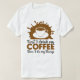 Esta camiseta branca apresenta um design gráfico com o texto "Primeiro eu bebo meu CAFÉ e depois faço as minhas coisas." A palavra "COFFEE" aparece de forma destacada em caracteres castanhos negros, enquanto o resto do texto está em um script azul escuro menor. Acima do texto está uma xícara de café branca estilizada sobre um pires, colocada contra um fundo de café marrom com sotaques de café.