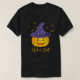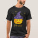 A camiseta unísex do Halloween apresenta morcegos voadores laranja e uma abóbora laranja vestindo um chapéu de bruxa roxa cheio de estrelas brancas brilhantes. Personalize o texto ao seu gosto.