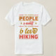 Este design apresenta uma camiseta branca com o texto "THE MORE PESSOAS * i met *" (AS MAIS * eu encontro *) em vermelho, acima de "THE MORE" em vermelho. Abaixo "O MAIS" está o texto "eu amo" em laranja, e "HIKING" em vermelho.