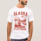 Esta camiseta branca apresenta uma ilustração monocromática ao estilo do desenho vermelho de uma mãe urso grizzly e seu filhote sentados ao lado de um rio numa paisagem selvagem do Alasca. Montanhas, árvores e um sol de ascensão ou de fixação estão representados no fundo. A palavra "ALASKA" é impressa em vermelho a negrito no topo, e "A ÚLTIMA FRONTEIRA" em letras vermelhas menores no fundo.