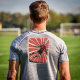 This stunning vintage-style poster beautifully encapsulates the fierce energy and unbridled passion of soccer. At its center, a dynamic footballer dons a striking red and black striped jersey, soaring through the air in an exhilarating leap to execute a dramatic header. The athlete's muscles are tense with determination, embodying the spirit of the game. Behind him, bold sunburst rays radiate outward, enveloping the scene in vibrant retro hues of deep crimson, classic black, and creamy tones, creating a breathtaking backdrop that amplifies the intensity of the moment.