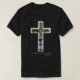 Revelação 5:5 Leão da Tribo da Camiseta Judah (Preta) com letra dourada. Frente de camiseta: Cruze com o rosto de um leão olhando através dela. "Leão da Tribo de Judah" Traseira da camiseta: "Jesus respondeu, eu sou o caminho e a verdade e a vida. Ninguém vem ao Pai, exceto através de mim." John 14:6