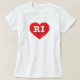 Esta camiseta apresenta um coração vermelho vibrante contendo as letras maiúsculas, brancas e em negrito RI, a abreviação oficial do estado de Rhode Island, o estado do oceano.