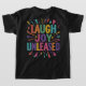 Um grande e ousado slogan de "Ria a Alegria Liberada" em uma fonte divertida e colorida. Um personagem de desenho animado ou super-herói rindo histericamente. Cores e gráficos brilhantes e brincalhões.