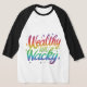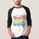 A camiseta ostenta o texto "rico e maluco" em um espectro de cores vibrantes do arco-íris. Cada palavra poderia ser uma cor sólida do arco-íris, com "rico" potencialmente escrito em negrito, ordem clássica do arco-íris (vermelho, laranja, amarelo, verde, azul, índio, violeta) e "maluco" usando uma ordem divertida e invertida ou um arranjo mais caprichoso das cores do arco-íris.