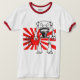 As coisas vão-lhe para trás, automaticamente, como um mecanismo, quase robótico. Esta camisa caracteriza um robô com um caráter japonês escrito nela. Há os raios vermelhos atrás de que simboliza o sol.