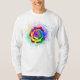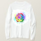Rosa grande e florescente com pétalas arco-íris sobre fundo branco, pintadas com pedaços de tinta colorida e brilhante. 3d