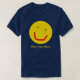 Um sol amarelo de olhos verdes sorrindo sobre um fundo azul. Adicione seu próprio texto.