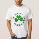 Uma T-Shirt com design de trevo verde e uma RUA preta. "O DIA DE PATRICK" escreve em volta.