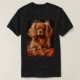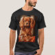 Um retrato detalhado de um Rei Cavaleiro Ruby Charles Spaniel. O cachorro está sentado sobre um tecido laranja e macio com suas patas bem colocadas na frente dele. Seus grandes olhos escuros olham diretamente para o espectador, transmitindo um senso de calor e afeto. O pelo do cachorro é meticulosamente detalhado, mostrando sua textura macia e ondas fluentes. Presente perfeito para amantes Cavalier.