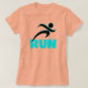 Use T-shirts, canecas, capuzes, tampas de tanques, botões, guardas, e muito mais com um corredor da silhueta preta e um texto azul aqua com a seguinte redação: "RUN"! Estes itens de roupa e presentes são excelente para qualquer um que adora correr, esteja você treinando para o seu primeiro 5.000, apenas goste de correr, ou que corra várias maratonas!