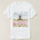 The image shows a watercolor painting of a windmill standing in a field of pink flowers.