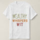 A t-shirt apresenta a frase "Wealthy Whispers Wit" num gradiente multicolorido vibrante. Cada palavra é uma forma diferente, criando um design dinâmico e atraente com uma estética limpa e moderna.