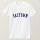Verifique para fora este t-shirt de Sactown! É você de Sacramento, Califórnia? Você tem um amigo ou um membro da família que amem Sacramento, Califórnia? Em caso afirmativo, este t-shirt da "bandeira" é exatamente o presente que você está procurando! As características de design "Sactown" na rotulação arqueada do marinho na pia batismal clássica da faculdade.