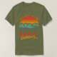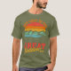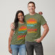 Esta design apresenta uma camiseta verde-oliva com o texto "GET LOST IN THE" em laranja, curvada ao longo do topo de um gráfico semicírculo. O gráfico mostra uma paisagem com montanhas, água e um pôr do sol listrado em tons de vermelho, laranja e amarelo. Abaixo do gráfico está a palavra "EXCELENTE" em vermelho, acima da palavra "Outdoor" em um roteiro de laranja estilizado.
